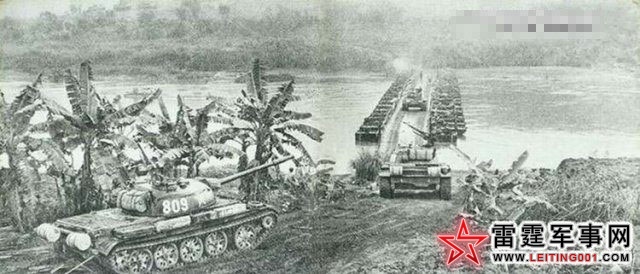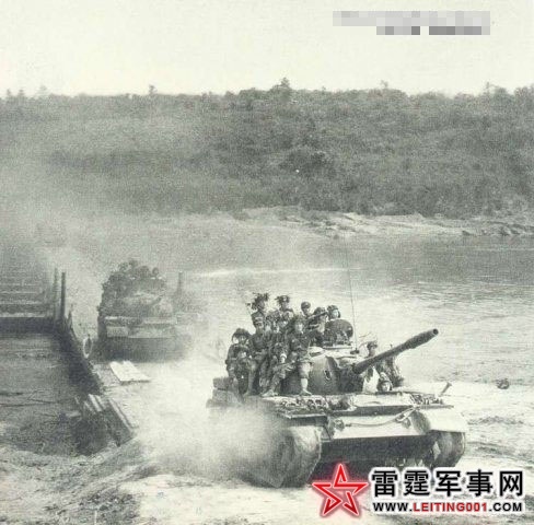 我坦克部队载满步兵战士涉水快速通过舟桥向越南廷进。