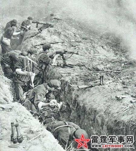 连长让话务员不停呼叫,于是炮击又开始了,我们已经冲到半山腰了。炮弹炸起的红色泥土和石头不停砸到我的身上。我已经快让红色的尘土埋起来了。炮击10分钟后,我们又开始了冲锋。敌人的火力显然已经弱了很多,一些暗堡已经让我们的炮火炸掉了,整个反击战期间,我们的炮火一直很猛。我一边冲,一边朝上扔手榴弹。反正,弹药多的是。这一方面要感谢我们的民工,他们流血牺牲保证了我们的弹药、饮食、医疗等必需品的供应;另一方面要感谢越南人。因为,他们的子弹和我们是通用的,战场上到处是通用的武器弹药。所以,弹药补充容易得很。在连天的喊杀声中,我们终于炸掉了一个又一个的暗堡,冲上了山头。山头上的十多个敌人已经全部战死,尸体已经都不成形了,到处是敌我双方的残肢断臂,为了这十多个敌人,我们友军的一个连几乎打光了!
