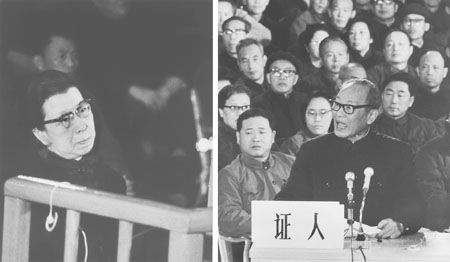 1980年12月12日,特别法庭第一审判庭第五次开庭审问江青。这是受害人廖沫沙出庭作证。(新华社记者刘少山、崔宝林摄)