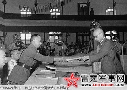 至此,何应钦宣布日军代表离席。日方7名代表肃立,向何应钦一鞠躬,然后,捏着军帽,鱼贯走出礼堂。只见冈村绷着丧气的脸,其余人亦神情惨淡。