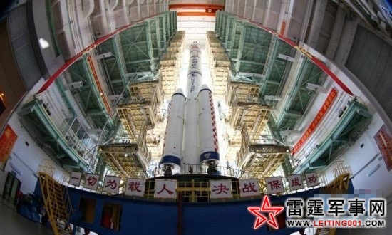 2012年6月9日神舟九号飞船在酒泉卫星发射中心垂直吊装厂房准备完毕,等待转运。