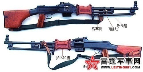 ▲ 苏联生产的RPD轻机枪,图中可见通条已从通条槽中向后抽出一部分,活塞筒与导气箍之间留有较大的间隙,护木上设有长方形凹槽