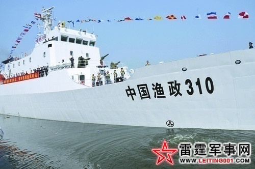 我国渔政310的自卫武器,可以看到舰载机枪和高压水炮